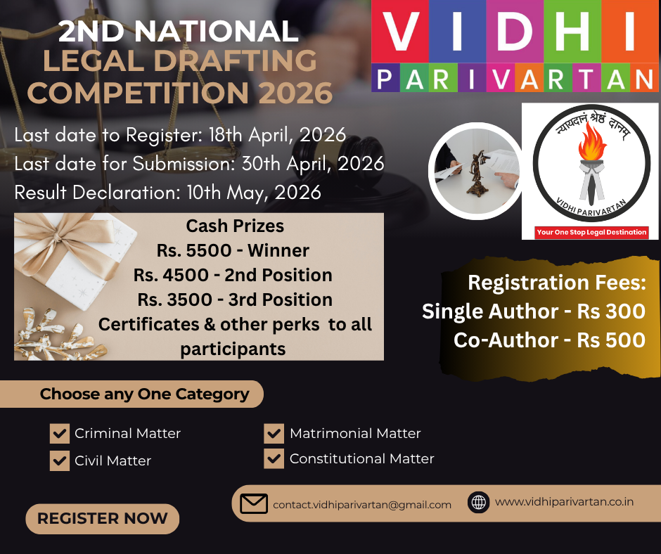 Legal drafting is the soul of advocacy and litigation. To refine the art of structured legal writing and argument formulation, Vidhi Parivartan is pleased to announce its 2nd National Legal Drafting Competition, 2026. This initiative is aimed at providing a platform for budding and experienced legal professionals to demonstrate their drafting prowess in civil, criminal, constitutional and matrimonial domains.