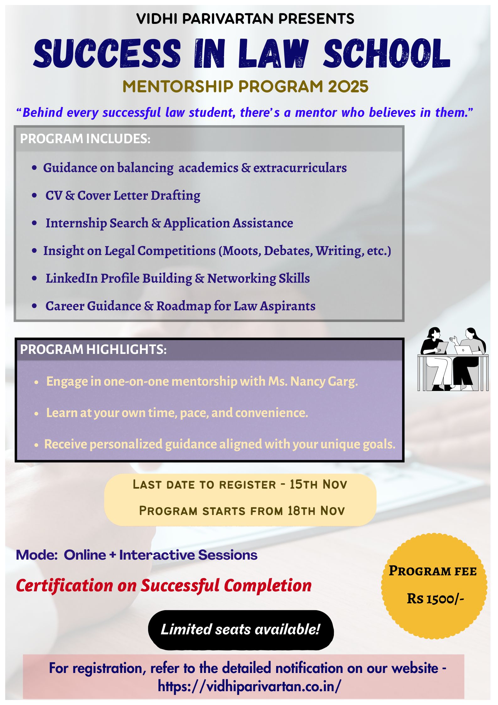 Vidhi Parivartan is delighted to announce the launch of its Success in Law School – Mentorship Program 2025, designed exclusively for law students who wish to make the most of their law school journey through guided learning, professional development, and personalized mentorship.